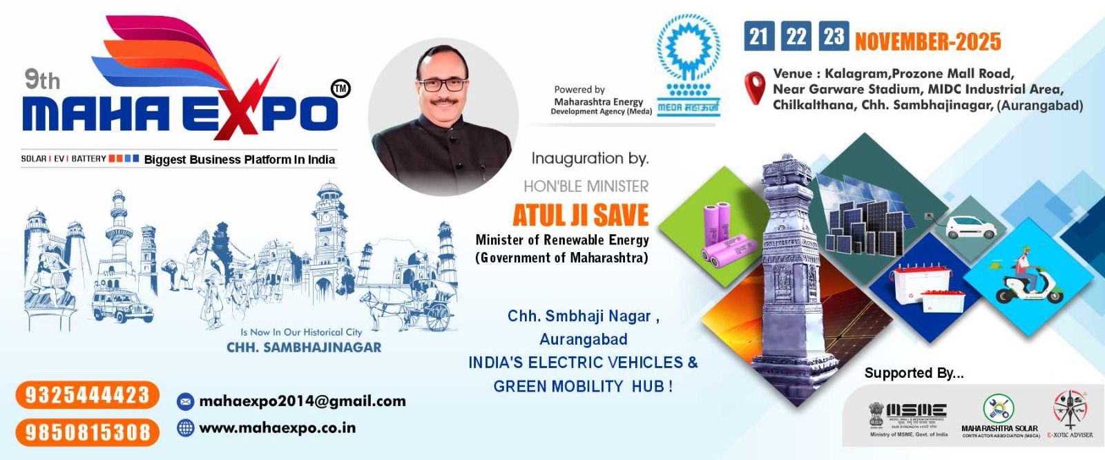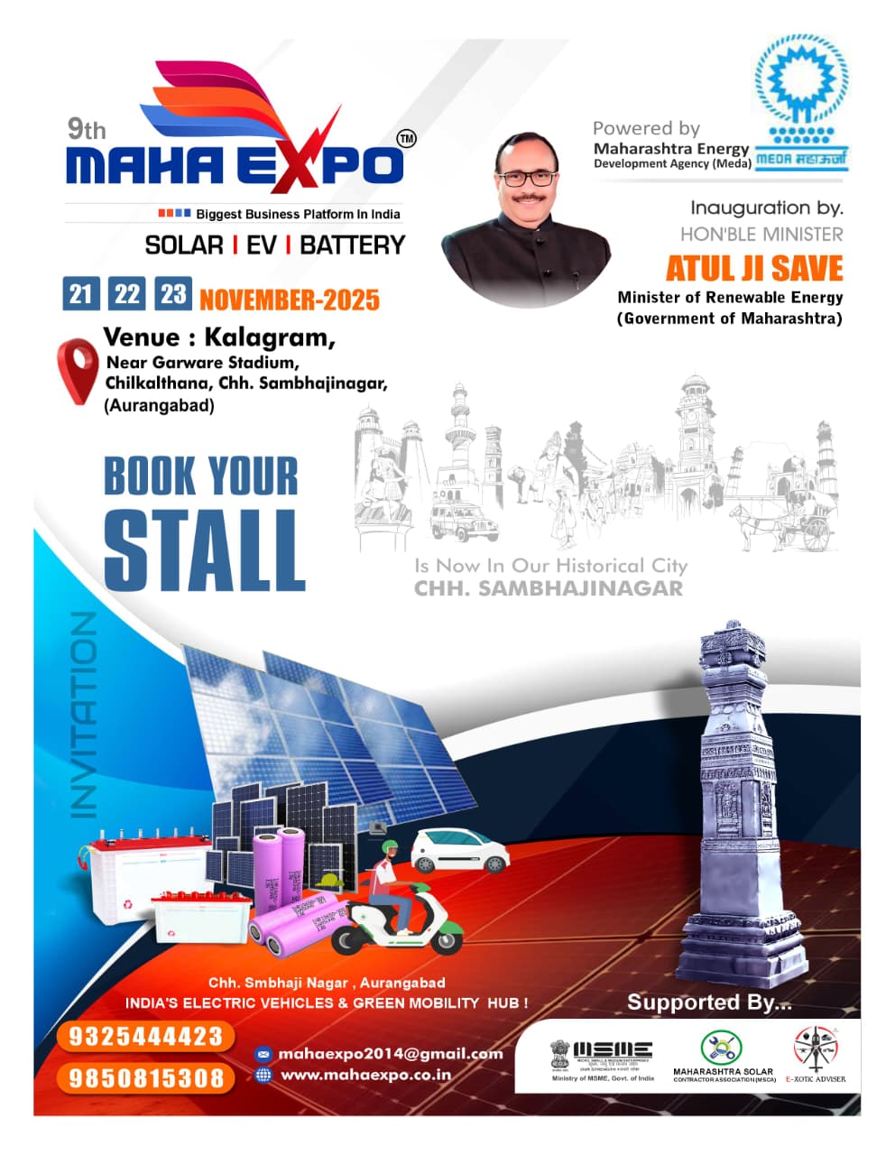 Get ready for the 9th MAHA EXPO – India’s Biggest Business Platform for Solar | EV | Battery technologies! 🌞⚡🚗 Join the movement towards a cleaner, smarter, and greener future at Kalagram, near Garware Stadium, Chikalthana, Chhatrapati Sambhajinagar (Aurangabad) on 21st, 22nd & 23rd November 2025.